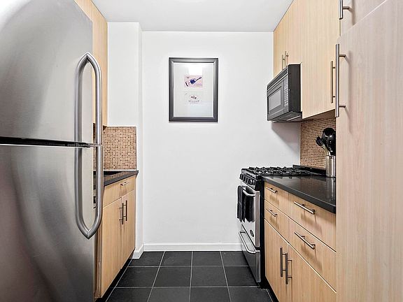The renovated kitchen is designed for modern living, with sleek granite countertops, a GE refrigerator, new Samsung dishwasher, Premier Pro Series Oven/Range, and an LG microwave. A stylish mosaic backsplash and slate tile floors add to the kitchen's contemporary feel. The apartment also boasts a recently updated bathroom, making it truly move-in ready.