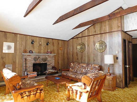 Adorable 2 bedroom ranch features an open floor plan with wood burning fireplace in the living room, kitchen with breakfast bar, sun filled sliders to a front deck, bonus storage shed
