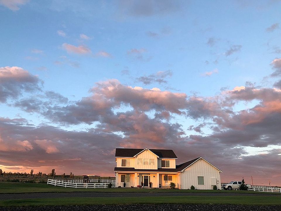 This beautiful custom farmhouse sits on 2.59 acres in a highly desirable area in North Pasco. Once you step inside this well thought out, open concept floorplan, you will instantly feel right at home. Fall in love with the amazing, unobstructed, views from every window. Special touches to make this farmhouse one of a kind include - shiplap in the entry, up a beautiful staircase and fireplace, custom stainless steel island top on extra large island, huge walk-in pantry and a laundry room that is set up for two sets of washers and driers. Large master on the main floor with one bedroom that are set back from entertaining/main living areas. The master bathroom has a 6ft fully tiled walk in shower with double shower heads, a 6ft soaking tub under a window - open the blinds and feel like you are bathing under the sky. His and hers vanities with beautiful granite. Upstairs is perfect for large families and entertaining. In this expansive upper level you will find two large bedrooms, a large bathroom with double vanity, a door to close off shower and toilet area and an extra linen closet for tons of storage. The second half of the upstairs is wide open with a wet bar and fridge. Need an extra bedroom? There is plenty of room to have a fifth bedroom framed. Den/office on main off living room. Large yard with over an acre of fenced in, irrigated grass. A 48x40 shop with two, 14’ garage doors was built in 2020. The septic was placed to allow for a pool anywhere out back. This is one you do not want to miss, lots of thought and love have been put into this home. The neighborhood is surrounded by orchards and is a true hidden gem. This house is turnkey. Move your furniture in and Enjoy! There is nothing like this on the market in North Pasco, don't miss out! Call/Text 509-521-3570 for showing *Serious inquiries only, please.