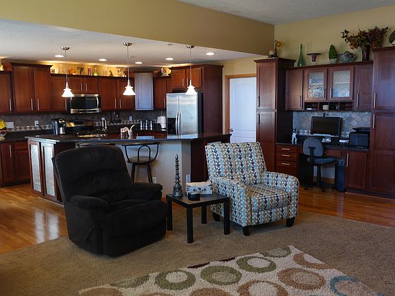This beautiful ranch home is located on a quiet cul-de-sac with quality schools right next door. This home was custom built in 2005 by the current owner. Located near a beautiful public park and affords access to the Legacy clubhouse and swimming pool. The 1679 square feet on the main floor features an open floor plan, high ceilings and windows with large transoms and between the glass blinds add interest and create a bright and welcoming environment. Carpet meets beautiful hardwood to delineate the living room from the dining area. Near the kitchen is a built in desk area. Cherry wood cabinets, granite, and quality tile are the stars of the show in the kitchen made for a cook. Pull out drawers and two pantries make cooking enjoyable and storage convenient. Appliances include a gas stove, side by side refrigerator with in-door ice and water, quiet Bosch dishwasher, central vac with a kick plate in the kitchen for quick cleanup. The eat-in dining room is bright and cheerful with a sliding glass door leading to a high deck with flower boxes. More large windows and the between the glass blinds require no adornment to distract from the clean lines and beautiful hardwood floors. This five bedroom house includes a master with a walk-in closet and master bath with a steam shower, double sinks and linen pantry with a separate toilet room. Two bedrooms in basement also with walk-in closets. All but one bedroom spacious enough for king sized beds and dressers. The home features a finished walkout basement with 1479 finished square feet and 200 square feet of storage. In the basement the wet bar features a built in fish tank in the wall and quality cabinetry. Gas Fireplace. Large windows and sliding glass doors with in-window blinds and a bank of windows flood the huge rooms with light. Two bedrooms with two more walk-in closets, a game closet, and more storage in the furnace room next to a new water heater.
