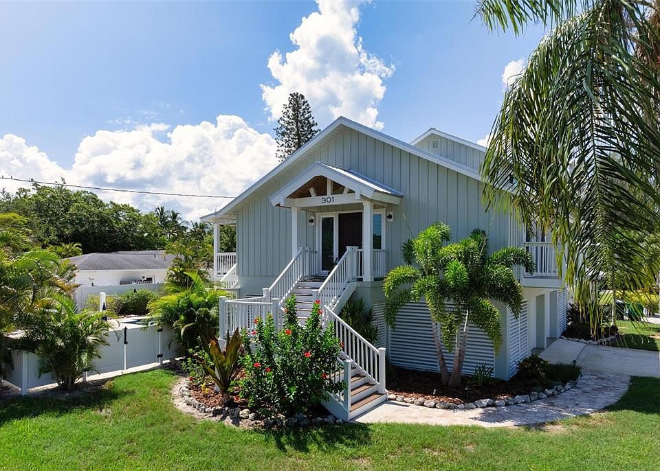 Welcome to your Coastal Retreat in the heart of Anna Maria Island, a true paradise nestled between the sand and sea. This elevated 3-bedroom, 3-bath residence offers an unparalleled Anna Maria Island experience. Just a 3–4-minute walk to the heavenly beaches of Anna Maria Island, perfectly situated north of the iconic Sandbar Restaurant and south of the picturesque Bean Point. Walk up the grand staircase to step inside and discover a spacious and inviting open floor plan, accentuated by soaring vaulted ceilings that create an airy and expansive atmosphere. The living spaces are bathed in natural light, enhancing the home's warm and welcoming ambiance. A little bit of old Florida cedar ceilings is just the right touch to feel like a local. Just off the kitchen is a covered outdoor porch for an easy, breezy evening meal outside while overlooking the fun pool and spa. This property boasts a mesmerizing swimming pool, the perfect oasis for relaxation and entertainment, day or night. From heated water in the cooler months to the colorful lighting at night, to the bubblers on the steps, you may stay here all the time. Surrounded by lots of play area for cornhole and such, plus plush tropical landscaping, the pool area offers a serene retreat where you can soak up the sun or enjoy a refreshing dip at any time. Underneath the house, the entire ground floor is covered with plenty of space for two cars, a golf cart, and a seating area to watch your favorite sports or a movie. Set on an oversized lot of over 10,000 square feet, this home provides ample outdoor space for your enjoyment or that of your guests. Whether you're hosting family time at the beach, setting up a vacation rental home or simply savoring the tranquility of your surroundings, the possibilities are endless. Location is everything on Anna Maria. One block off the hustle and bustle of North Shore Drive, this property located on the corner of Holly and Iris creates incredible privacy. Whether taking a leisurely morning walk along the shore, watching breathtaking sunsets over the Gulf of Mexico or relaxing in your the pool's built in spa, you will never want to leave. Beyond its beauty and comfort, this property offers outstanding vacation rental income potential. Its desirable location, luxurious amenities, and spacious layout make it a sought-after destination for vacationers seeking the perfect getaway. Take advantage of the booming vacation rental market and enjoy an excellent return on investment. Being sold turnkey furnished, no detail has been overlooked. All new and ready to be enjoyed. Just bring your swimsuit and your favorite book or tunes and you can feel the stress fade away. Don't miss this rare opportunity to own a piece of paradise in one of Florida's most sought-after beach communities. This exceptional property is not just a home; it's a lifestyle. Contact us today to schedule a private showing and make your coastal living dreams come true.