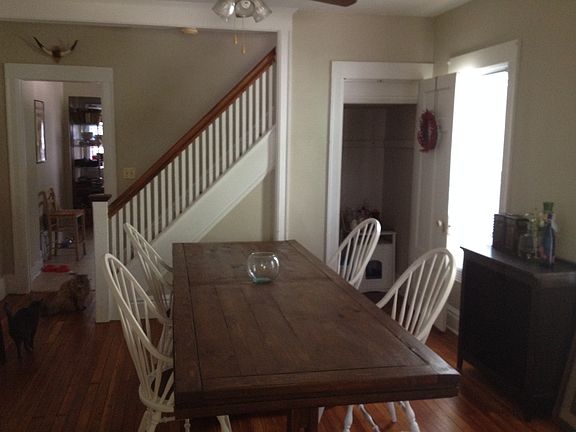 House is a side by side ,each half has a porch, basement ,first floor has living room ,dining room,kitchen,second floor has 2 bedrooms & small office & attic,shared back yard .Kitchen & bathroom have been updated,Quiet neighborhood,Laundry hookup in basement, One year lease ,landloard pays water,tenant is responsible for RGE