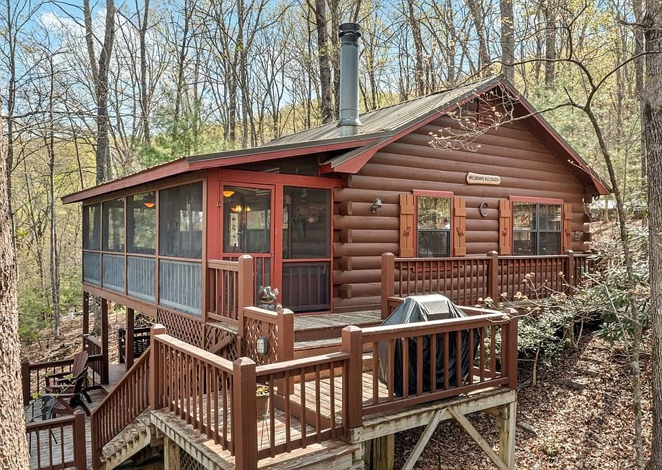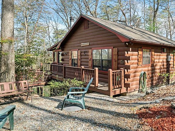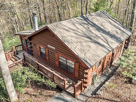 Bears allowed!!! Come to the North Georgia mountains to hibernate in your own Sisson built log cabin that has been well maintained and meticulously cared for. One family-owned cabin was used only as a part-time residence! Here, you will feel invited to unwind on multiple outdoor decks, to enjoy the serene surroundings. This home is located within the sought after Laurel Ridge community. Enjoy the long weekends listening to the birds on the screened-in back porch situated on a private lot just under 1 acre. Cuddle up to a cozy fire on a crisp spring night outside with one of the two fire pits or inside snuggled in front of the floor to ceiling stacked stone, wood burning fireplace. As you enter you are greeted by an open concept of living, dining and kitchen space. The eat-in kitchen easily seats 4-6! The kitchen is fully functionable with lots of cabinets and a full-sized pantry closet for dishes and extra appliances. Kitchen is equipped with Stainless steel appliances and are in excellent condition!! Community is on a shared well. This home possesses a low maintenance tin roof! Warm, wide plank knotty pine wood floors and vaulted ceilings enhance a spacious feel to this charming cabin of 672 Sq. ft. The 2-bedroom, 1 full bath home is ready to move into as a full-time residence or can be used as a short-term rental, or a weekend vacation home and comes fully furnished except for a few personal items, with everything you need, including laundry. Outside is a 8 X 10 sturdy-built outbuilding with electricity and is enforced with extra support and flooring. Making it perfect for your ATV, golf cart, bikes or outdoor tools! Here you can explore all that North Georgia has to offer. Outdoor enthusiasts will love places to see such as Aska Adventure Area which includes the Stanley Gap loop for biking, hiking, boating, fishing, kayaking, rafting & tubing. Cabin is located within walking distance to the Benton MacKaye Trail. Easy access to downtown Blue Ridge & Ellijay.