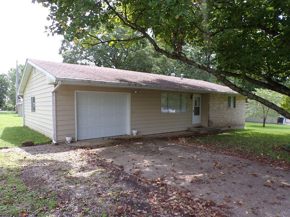 2BD/1BA Ranch Home on Double Lot. Solid, well maintained Cut Stone and Steel sided Ranch style home has propane central heat and central AC. Eat-in Kitchen has lots of cabinets, tile back splash- refrigerator, LP range and portable dishwasher included. Laminate flooring in 13x18 Living room. Both bedrooms have carpet and large closets. Washer and Dryer included. Attached 1 car garage w/opener. Large 140x170.5 lot has gently sloped huge back yard with 18x22 RV Carport, 11x12 Storage Building w/concrete floor, large Garden area and clothes line in place. Deep Freeze also included.