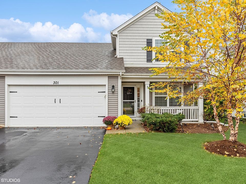 Curb appeal welcomes you home to this spacious, better than new duplex in the hidden gem Cambridge Lakes subdivision of Pingree Grove. A front porch offers the perfect spot to greet guests and leads into an oversized front room flooded with light and complemented by custom wainscoting. An open concept living room flows into your dining room and oversized chef's kitchen offering a brand new stainless steel appliances and tons of counter space for culinary experiences and entertaining. Sliding doors lead you to your own oversized backyard featuring a brand new custom concrete patio and privacy fence - a perfect spot for family, friends, and Fido to gather! A huge laundry room, powder room, and two car garage complete the first level. Upstairs, a gracious ensuite with a walk in closet, shower, and soaker tub offers the perfect place to unwind after a long day. Two additional bedrooms with plenty of closet space and a shared bathroom - plus a huge bonus loft space - make this the perfect home for first time buyers and families alike. A community space, party room and fitness center within the community help make 301 Maryland Lane the perfect place to call home.