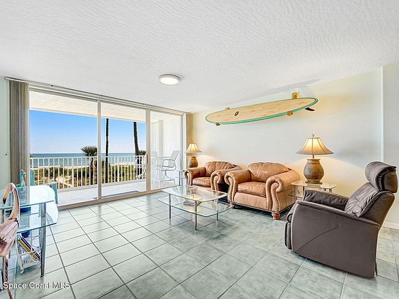 Oceanfront condo offering postard-perfect views from the living room, dining room, kitchen and master suite. Wake to the sound of waves and then step outside for endless beach walks, fishing, swimming, or surfing just beyond your door. From your private balcony, enjoy sweeping coastal views and thrilling rocket launches. Only steps from vibrant downtown Cocoa Beach dining, shopping and nightlife, this coastal retreat features, tropical tile floors, cozy bedroom carpet, and primary suite with dual closets, walk-in shower, and soaking tub. Two guest bedrooms, a second full bath, and a laundry room with full-size washer and dryer provide comfort and convenience. Resort-style amenities include heated pool, spa, fitness center, two elevators and private beach access. With a 2026 balcony refresh-new railings, hurricane sliders, shutters, and flooring-already paid for, this furnished turnkey home delivers the ultimate oceanfront lifestyle.