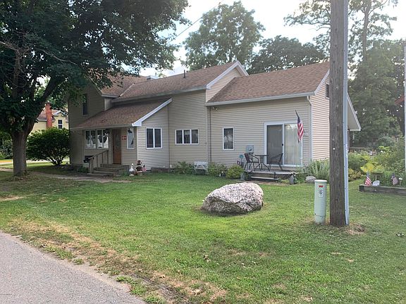 Very nice well maintained home in Greenville on a 1/4 acre lot with frontage on the Flat River. This home has a formal dining room, nice living room, kitchen, spacious laundry room, pleasant sun room, office or storage area with sliders to the front of the house, mainfloor bedroom and bathroom. The upper level features 4 nice size rooms that are currently used for bedrooms, however you have to go thru one room to get to the next. There is also a nice full bathroom on this level. The lot has underground sprinklers, the main floor has central air, the upper level has a window air conditioner. Newer plumbing, electrical, roof & vinyl siding, all appliances are included and are also newer. The 45 x 20 detached garage has a garage door opener & room for storage. Call today for a tour!