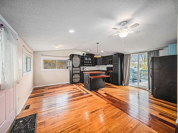 Well-maintained home with numerous updates including newer windows, siding, roof, deck, drain field, furnace, AC, egress window, copper plumbing, water heater, and an updated kitchen with cherry countertops. The main level features vaulted ceilings throughout, hardwood flooring, and an open-concept kitchen, dining, and living area. A slider off the dining space leads to the backyard deck, and the covered front porch offers additional outdoor living space. The main level also includes 2 bedrooms, 1 bedroom has a built-in Murphy bed, and a full bathroom.