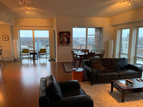 Enjoy the excitement of urban living in this stunning M2 condo. Floor to ceiling windows (with electric blinds) provide sweeping views of Downtown, The University of Illinois Campus, and West Side Park from every room. Private, two bedroom unit features a split-bedroom design, newly installed hand scraped wood floors throughout, sleek open floor plan kitchen w/ maple cabinetry, granite tops, mosaic tile back splash, stainless appliances, a generously sized breakfast bar w/ seating for 4 + and large utility room/pantry. Master suite features custom walk-in closet, spa-like bath with honed granite vanity & walk-in, dual headed shower. 2nd bedroom also has a custom double closet & adjacent bath. Private balcony, great storage, abundant natural light. Enjoy all the conveniences of this premier location including fine restaurants, pubs, shopping & entertainment. Secure building w/ available parking in city owned garage. Water, trash, and sanitary included. Tenant pays power and internet.