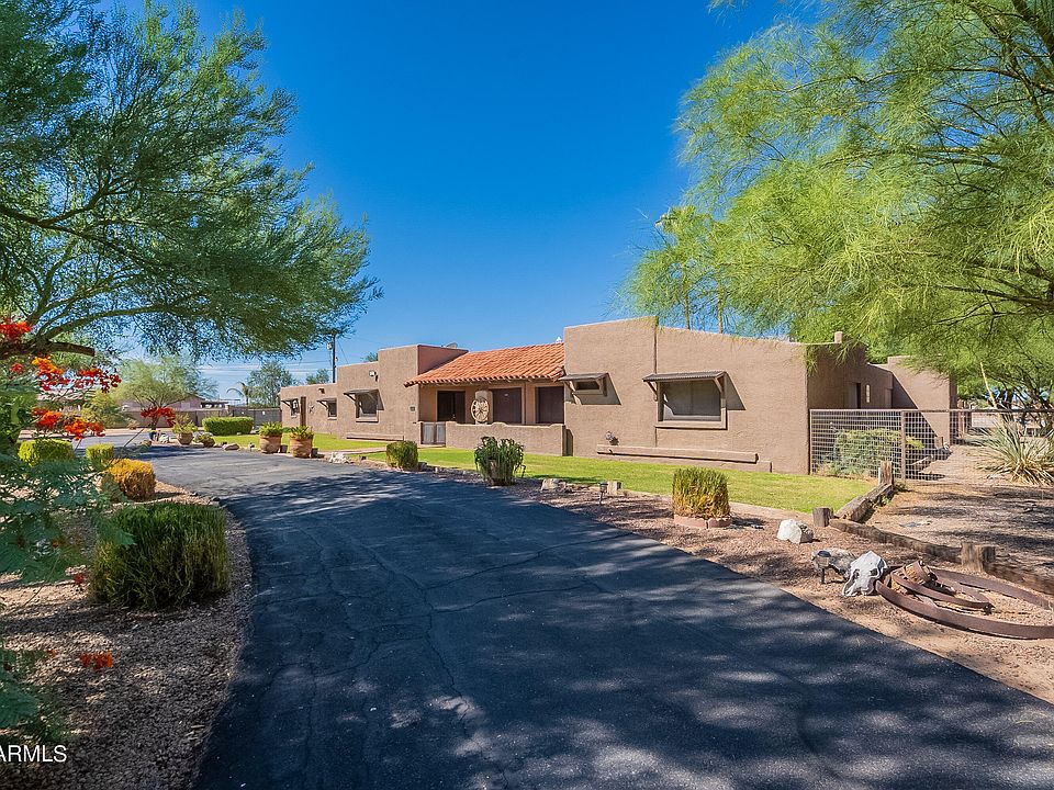 SELLER MAY CARRY. This property is fully equipped with a ROPING ARENA, RV SHADE, LARGE TURNOUTS, BARN, TWO ROUND PENS, TACK ROOM, GUEST HOUSE. Situated on a sprawling 5-acre property, this beautiful house offers a harmonious blend of comfort, style, and outdoor living.As you arrive, you'll be greeted by the lush landscaping and well-matured trees that surround the home. The driveway is paved with asphalt, ensuring a smooth entrance to your new abode. With its ranch-style charm, this 4-bedroom, 3.5-bathroom home spans an impressive 3,280 square feet.Step inside and be captivated by the spaciousness and elegance that awaits. The large eat-in kitchen provides the perfect setting for culinary delights while allowing you to effortlessly engage with your guests gathered around the cozy fireplace. As evening falls, step outside and indulge in breathtaking sunsets as you relax by the sparkling pool and spa. Located conveniently within Casa Grande, you'll have easy access to nearby amenities such as shops, restaurants, parks, and schools. Additionally, major transportation routes are just moments away, making commuting a breeze.