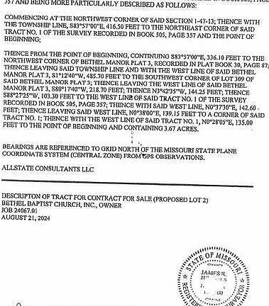 This property was annexed into the city limits in 2025, rezoned to R-2, and approved for connection to the city sewer. Per appraiser, 3 duplex lots per acre should be the rule of thumb. Nikki Way, 1st street to the north, and Tessa, 1st street to the east. Sewer plans by Allstate Consultants. Buyer must permit Bethel Baptist Church to connect to the main sewer line. BUYER needs to agree that Bethel Baptist Church sewer will be connected to the main line crossing the 3.67 acre tract within a year after closing