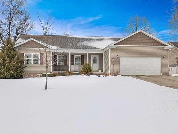Enjoy condo style living and single level ease without the restrictions! A welcoming front porch, well-manicured grounds, and desirable cul-de-sac locale make a positive first impression that carries into the interior of this Neshannock Township ranch sprawler. Great room concept living space resides under soaring ceilings in free-flowing living, dining, and kitchen areas, and neutral flooring and walls create a blank canvas for you to exhibit your own personal style. Raised panel oak kitchen of thoughtful design with stone-look tile back splash and ceramic tile flooring. This space opens to an open-air deck and manageable 1/3-acre yard. Privacy friendly split bedroom design. Expansive owner suite. A full wall closet and walk-in closet accompany the en-suite bath. A main level laundry, centered between the garage and the basement access, limits dirty footprints to the main areas of this spotless home. Ready to finish 13-course block full basement. Climate controlled garage.
