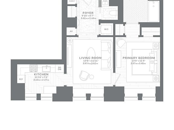 Two oversized south-facing windowsAbundant natural lightExpansive primary bedroomHerringbone white oak floorsCustom architectural detailingHigh ceilingsTwo generous closets