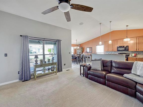 6x22 Entry Foyer Opens to Vaulted Great Room, Kitchen and Dining Room all overlooking the 10x12 Covered Patio w/Ceiling Fan and TV Connections and 16x19 Uncovered Patio with Fire Pit, Sitting Wall and Level Landscaped Backyard. 42" Light Maple Cabinets, 2 Tiled Back Splashes, Double Sink in the Peninsula, Pendant Lighting and Huge Lighted 5x6 Walk in Pantry. Coffered Master Bedroom Ceiling w/Ceiling Fan, 2 Closets, 1 5x6 Walk-in, adult Height Single Bowl Extra Long Vanity, Walk in Shower. Ceiling Fans in Both Secondary Bedrooms and Great Room. Half Wall around Stairwell to Basement with one 15x15 mostly Finished Room, Full Rough in, Sump Pit and Pump, Gas Furnace and Water Heater, Egress Window. Security System, Private entrance from Garage to interior, Overhead Garage Door Opener, Extra Concrete Width added to Driveway.