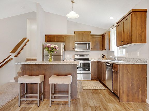 Quick closing possible! Welcome to this stunning home with a private backyard and great views! 3 bedrooms, 2 full bathrooms, cultured marble bathroom counter tops, open kitchen living and dining room with vaulted ceilings, stainless steel appliances, huge entry way, custom cabinetry, concrete driveway, irrigation and located in cul de sac with walking trails!