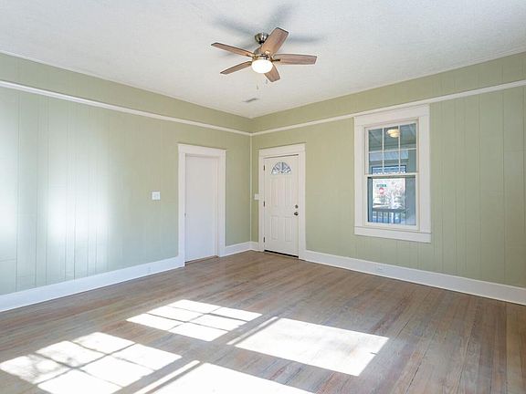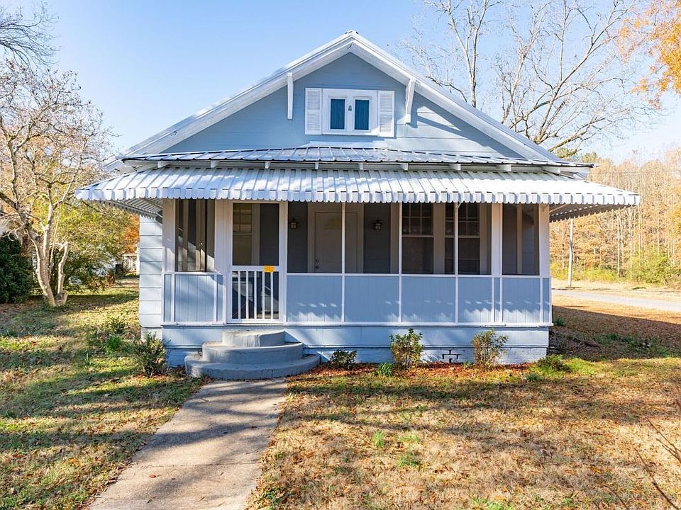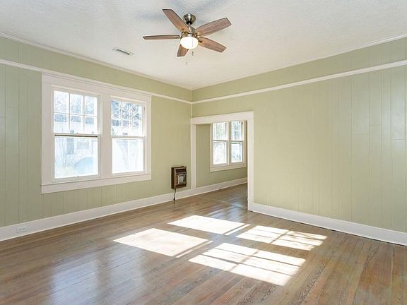 This beautiful home in Sylacauga is nestled on a quiet street with 3 bedrooms/1 bath with a great covered porch with vaulted covering. Large bedrooms with high ceilings equipped with ceiling fans. All rooms are freshly painted with pastel modern colors. Classic kitchen with formica counter tops and beautiful back splash. The kitchen is equipped with all appliances excluding the washer and dryer. Washer and dryer hookups are available. In addition, the home includes an over sized workshop, side deck and carport.Call us today to schedule your free tour at (205)410-8785 living room and den combo, nice sized kitchen and covered front porch
