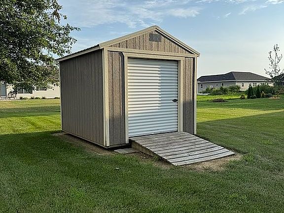 ? Open floor plan, a spacious living room with stone fireplace, large sunroom with great views of the pond & park. Concrete patio on the back of the house and small shed.
