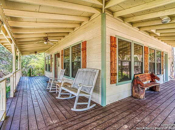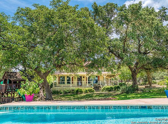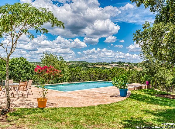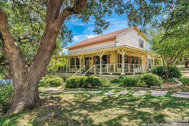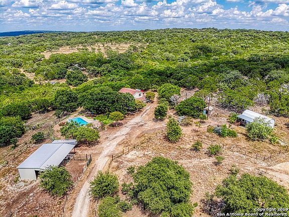This property is breaktaking! A "country cabin" feel with a wrap around porch overlooks a NEW 2019 in ground salt water pool. The property sits on 7.22 acres with incredible views of the hill country. This property features a separate living quarters with a full bath, partial kitchen & WD. Property features a garden, horse barn, tack room, chicken coop, craft room, electric gate & 3 year old roof. Cross fencing throughout the property. Owner is receiving $100 per night for separate quarters from AirBNB.