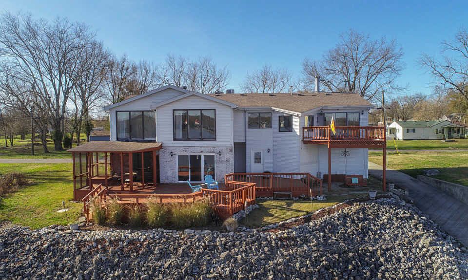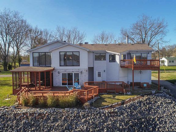 The view alone is priceless. Sitting right across the river from Captain's Quarters, this home offers more than the river view. First level could be used as a mother-in-law suite with separate bedrooms, bathroom, and wet bar that can be converted back to a kitchen. First level has own private screened in porch and opens up to a large deck. First and second levels could also be split if preferred to make into a duplex. Upper living room has entertainment center that stays and a cozy fireplace for cold nights. Step on out to the deck off the living room and relax on warmer days. All new carpeting on upper level. Main bedroom has large walk in closet with an added room that could be used as a 5th bedroom, nursery, or sitting room. With gorgeous views from the main bedroom, you may never want to leave. Take advantage of true river life by sitting by the firepit or tie up your boat on the newly finished dock. Become a part of the laid back river community!
