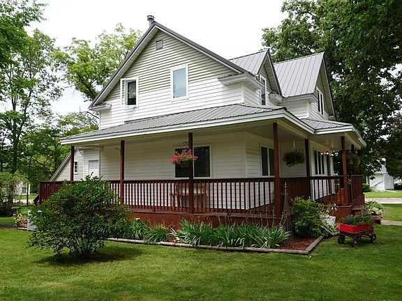 Beautifully restored millworks stylishly blended with updates for today’s living throughout this fully remodeled 3 bedroom, 2 bathroom home! A classic wrap around porch welcomes you as it flows around the house to the large backyard. The 0.2-acre corner lot offers mature trees, perennial plantings and garden areas along with plenty of open yard space. The 2-car detached garage (24 ft x 20 ft) with storage loft is just steps from the back door. New windows, siding and metal roof on the house and garage. The home's main level has been renovated with an open floorplan featuring a large living room, dining room and stylish kitchen. Down the hall is a large full bath with laundry. Upstairs are 3 bedrooms and a 3/4 bath with a must-see custom tile shower. New furnace, central air and water heater in 2021. This home is truly move-in ready!