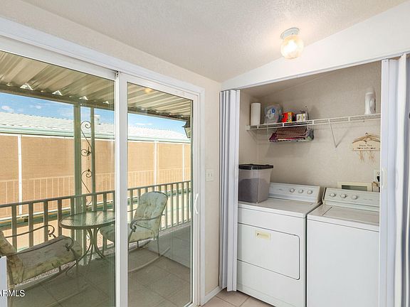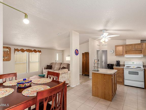 This beautifully furnished, turnkey property features 3 bedrooms and 2 bathrooms, making it the perfect space for snowbirds or full-time residents. With a bright and open layout enhanced by eastern exposure, natural light floods the living areas, creating a warm and inviting atmosphere. Enjoy a seamless blend of style and functionality with neutral décor. The split floor plan ensures privacy, with two guest bedrooms positioned on the opposite end of the home. Dual-pane windows adorned with faux wood blinds provide both elegance and energy efficiency throughout. This all-electric home offers modern conveniences and all appliances you see are included. Outside, you can enjoy an easy to maintain landscaping and added storage with an outdoor shed that has shelving. Located within the Superstition Buttes Mobile Home Park, this community offers an array of great amenities for you to enjoy. Take a dip in the heated pool and spa, stay active in the clubhouse and fitness room, or practice your golf skills on the "pitch and putt" golf course. You can also enjoy the breathtaking views of the Superstition Mountains. Furniture also conveys with this property, making it turnkey.