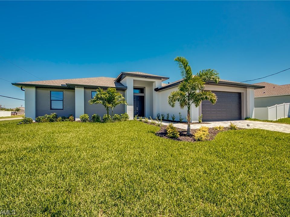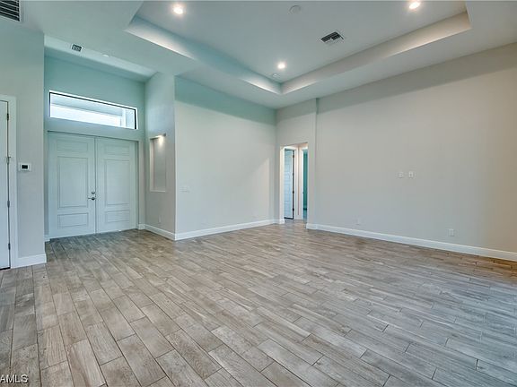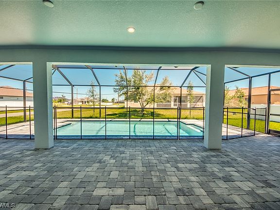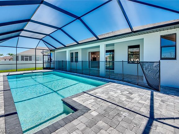 NEW CONSTRUCTION - JUST FINISHED! This 4 Bedroom, 3 Bath, 2 Car Garage home comes with all the Bells and Whistles. Home is 2,010 sq ft under air with a total of 3,998 sq ft when you include your 1,402 sq ft lanai with an oversized pooll! The Kitchen has been decked out with 42" All Wood Cabinets, Stainless Steel Appliances, Upgraded Countertops, and a huge Kitchen Island. Designer plank tile flooring installed throughout the home including the bedrooms. This home has a Paver driveway, Paver pool deck, complete landscape package with sprinkler system and flora tan sod. The interior specs are 12’ Ceiling in living area, 8' doors, 5 1/4" Baseboard with 3 1/4" Casings, Soffit lighting outside, Frameless Glass Shower Enclosure, Stand Alone tub in the master bath, Trey Ceilings in the living room and master bedroom, pendant lighting in the kitchen, pool bath and so much more. This home is located in the desirable SW section of Cape Coral and comes with a 1 year builder warranty