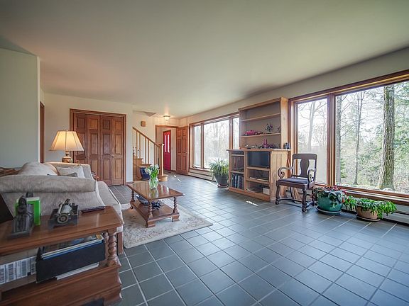 Welcome to 301 Seneca Creek Road in Hinesburg. Its serene setting, both welcoming and secluded, includes mature trees, stone walls, trails to walk and hike for hours and a unique home. Custom-designed and built by its original owners, the house sits at 1400 FT elevation, offering wonderful views in all directions, including a view of the Adirondacks and a glimpse of Lake Champlain. If privacy is your desire, this is the spot for you. Entering the spacious home, you see a 36-foot-long Great Room that benefits from passive solar heat due to a south-facing wall of windows. A ¾ bath and a small wine room with a wet bar on this level give you the option for an in-law space or office. The house is completely accessible with step-free entrances and an elevator from the garage to the upper levels. On the second level the expansive living room looks out onto the woods and is flooded with sunshine. The large dining room is perfect for your gatherings. The kitchen has a center island and newer quartz counter tops and backsplash and a cherry-red refrigerator. The laundry room is where you will find the elevator, as well as a fantastic family/recreation room along with two bedrooms. The third level offers three bedrooms including the primary suite with custom-tiled walk-in shower. Cedar clapboard siding and a standing-seam metal roof make a virtually maintenance free exterior. Live surrounded by nature yet close to Hinesburg village, excellent schools, Burlington and Lake Champlain.