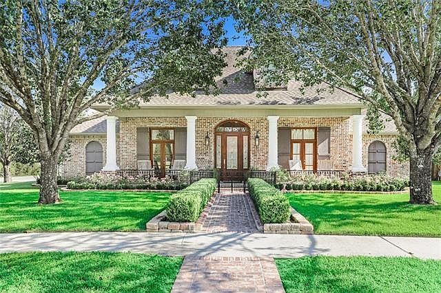 Discover Southern charm at its finest in this exquisite Louisiana-style home situated on a corner lot in Southdown Subdivision. The brick front porch welcomes you, featuring a glass-centered door, French windows, and gas lanterns. Inside, the beautiful hickory flooring flows through the foyer, family room, and formal dining area, accented by triple crown molding that adds a touch of elegance. The chef's kitchen is a culinary delight, boasting brick floors, GE appliances, granite countertops, and a 6-burner gas stove. Retreat to the screened patio and immerse yourself in the tranquility of the 32' x 37' courtyard-style oasis, complete with a fireplace, full kitchen, and charming gas lanterns. This home offers 4 bedrooms, 3 full baths all down with a bonus room up. Generous space for indoor and outdoor entertaining. Experience the epitome of Southern living.