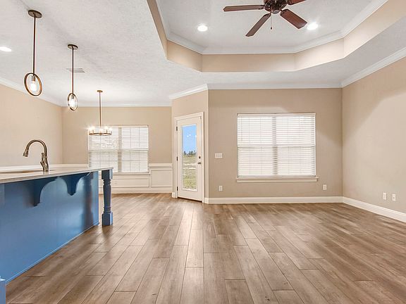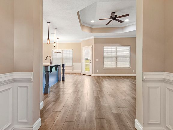 The living and dining areas offer a spacious and open layout, providing flexibility for various furniture arrangements and creating an inviting atmosphere for gatherings. The home features trey ceilings, adding a touch of sophistication, while upgraded lighting fixtures contribute to an overall polished look.