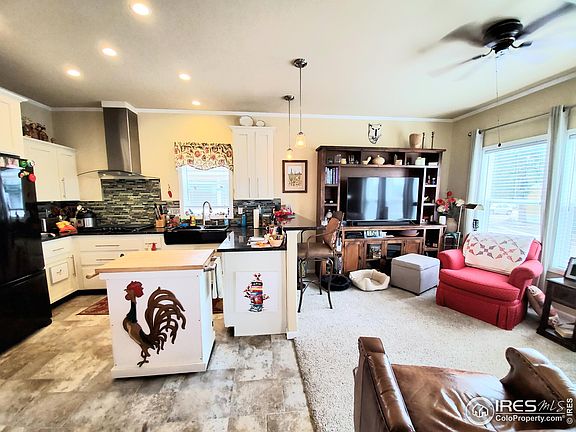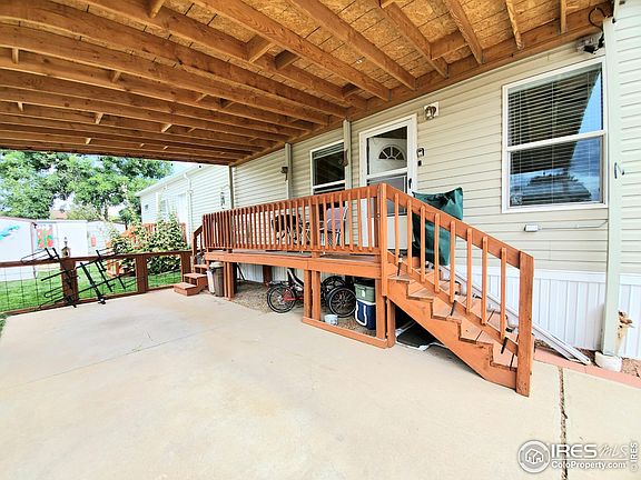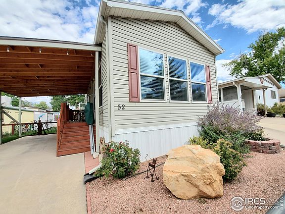 This is probably the nicest home in the best 55+ community in northern Colorado! Beautiful custom home designed specifically for this site. Huge extra tall carport also covers the front entryway of the home. Once inside you find the living room in the front of the home, taking advantage of the mountain views. Living room opens to the kitchen with granite counter tops and custom cabinets. All the (upgraded) appliances are included. Primary bedroom has large walk in closet and luxurious 4 piece bathroom. 2nd Bedroom is non-conforming and makes an excellent office space/ guest room. Outside has gorgeous, well maintained landscaping complete with a fully fenced yard and established plants/ flowers. 2 Storage sheds for all the extras. Park is called Highland Manor and is loosely a 55+. They allow small to medium sized dogs and indoor pets. Well maintained community shows pride of ownership and comes with the lowest lot rent around currently at only $450, and that includes interior and exterior water, sewer and trash. Financing is available if needed, call listing agent for more info or to schedule a showing. Don't live with the regret of knowing that you've missed this one!