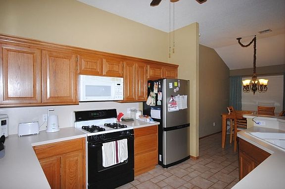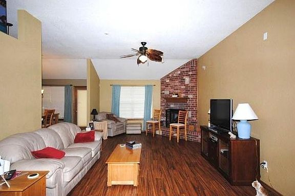 The home is a great floorplan with huge fenced yard, nice covered patio, wired for surround sound and more. Laminate wood flooring in family and tile in kitchen and dining.