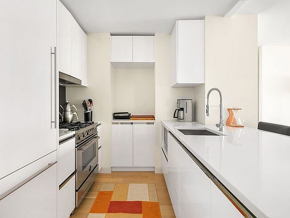 - The full-size kitchen is outfitted with Quartz countertops, white lacquer cabinetry, a Bertazzoni gas range, Bosch panelized refrigerator and dishwasher, and stainless steel microwave.