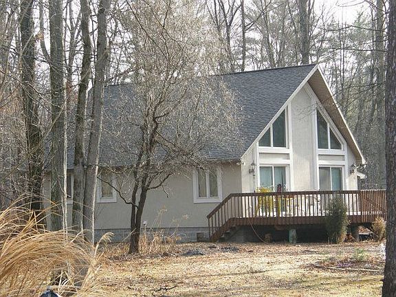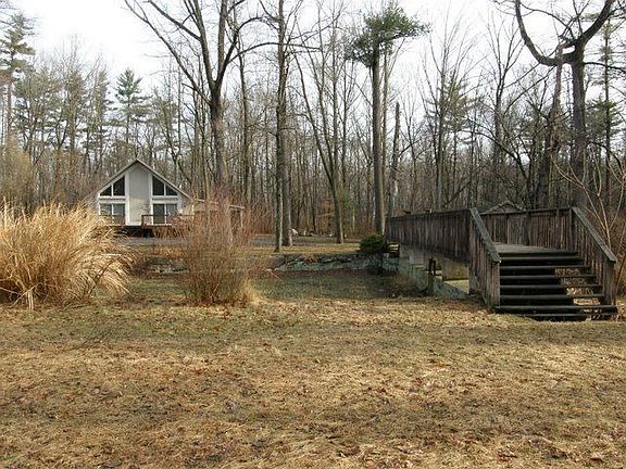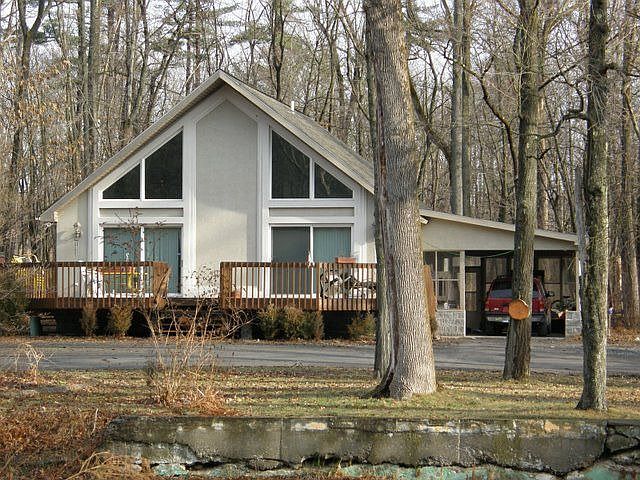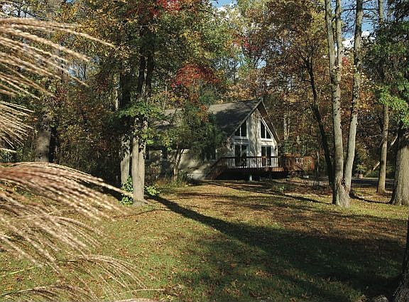 Gorgeous private wooded A-frame property. Stream has a nice deep watering hole for swimming. The pretty 1382 square foot chalet boasts cathedral ceilings 2 sliding glass doors off kitchen and family room onto front porch. Two huge storage rooms in Master Bedroom. Washer/Dryer hook-ups, Moen Fixtures. Property also includes a large 3 car garage/workshop.