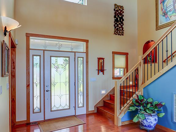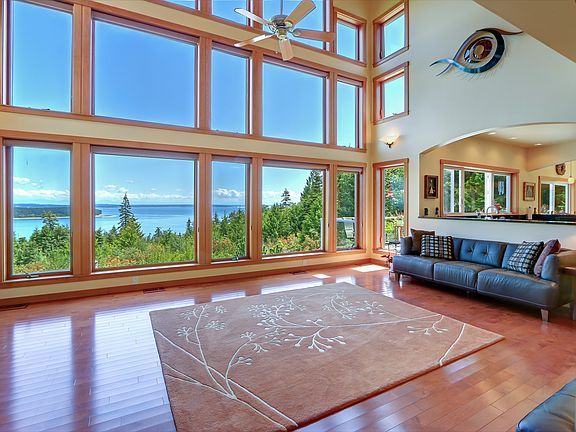 Breathtaking panoramic water views with an extraordinary Cascade Mountain backdrop! Profound natural beauty & custom construction combine for a private & elegant masterpiece! A grand entrance with nearly 30' ceilings in the foyer opens to an inviting floor plan with dramatic floor to wall ceiling windows, quality hardwood floors, superb kitchen & master suite w many more fine high-end touches. Stunning views of shipping lanes from most rooms. Gated entry and 1.78 acres of lush easy landscaping.