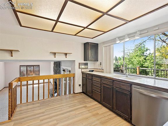 This Village Park beauty tucked away on a cul-de-sac has ample parking and storage plus a gorgeous 28’ x 15’ composite deck (installed 2019) in the fenced back yard backing to Pikes Peak views * Brand new vinyl flooring, carpet and interior paint throughout * Main level boasts vaulted ceilings in the entry and living room plus formal dining room and stainless steel appliances in the kitchen * Walk-out rec room just a few steps down from kitchen and a few steps up from deck has a moss rock fireplace * Moss rock fireplace continues up into the master suite * New storage shed (only 2 years old) next to covered flexible storage space with access to driveway for maximum convenience * Lush green sod yard in front and back * Large windows * Washer and dryer included * Convenient central location – an easy walk to Penrose Elem/Park and just minutes from the acres of hiking and fun in Palmer Park and also the shopping, dining, and entertainment of the Powers Blvd corridor *