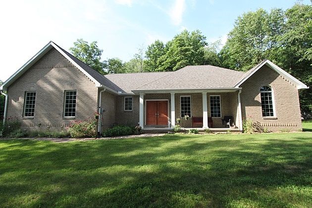 Private paradise on 3 wooded acres with creek and abundant wildlife. All brick custom 3 bedroom 2 bath 1747 Sq Ft ranch. Split floor plan/open concept, Brazilian Cherry hardwood floor and ceramic tiled laundry and baths. Custom built cabinets of solid PA cherry with black granite counter tops and ss appliances. Center Island designed as furniture and can be moved as desired. Private master suite with 16 x 6 closet and 16 x 9.5 bath with great view. Laundry near master suite. 3rd bedroom has French doors and designed with closet space for home office. Covered front porch and 23 x 5 covered back porch outside living areas. 25 x 21 garage with Overhead carriage style doors and floored attic above garage for storage. This home is country with great convenience to shopping, hospitals, dining only 8 to 10 min to I-70. City water with septic system. Realtor owned.
