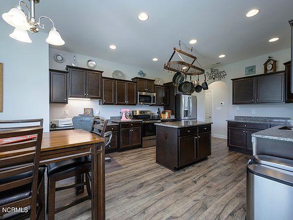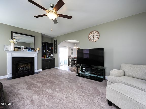 This two story, 2021 Sydes Construction home features two primary suites, arched doorways throughout the main living space, a massive fenced-in backyard and a convenient location to both Historic Downtown New Bern and MCAS Cherry Point in Havelock. Welcome guests from the front porch to join for conversations in the spacious living room around a cozy fireplace with built-in shelving. Have granite countertops, stainless steel appliances, an island and breakfast nook in the kitchen to aid in preparing favorite meals. Gather in the formal dining room for dinner parties and holiday celebrations. Find the first primary suite on the first floor complete with a tray ceiling, huge walk-in closet and an en suite bathroom with a dual sink vanity, walk-in shower and separate tub. Head upstairs to find the second primary suite that has added features like a private sitting room, a larger walk-in closet and separate vanities in the en suite bathroom. Have three spare bedrooms upstairs, each with their own walk-in closet, to offer guests a comfortable space of their own or the flexibility to have a private home office. The massive fenced-in backyard is complete with a covered back patio for hosting barbecues and rubber mulching that allows for easy maintenance around your landscaping. Find this home just minutes from local establishments and the heart of New Bern. Contact us today for your private tour!
