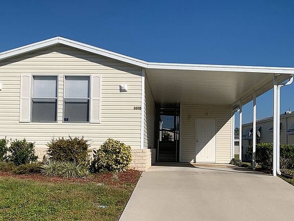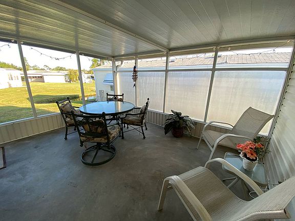 This is a mobile home for sale in a 55+, gated, pet friendly community on a rented/leased lot. Come check out this updated 2003 2BR/2BA mobile home consisting of over 1,000SF. There is a screened, side set lanai with a pond view. It sits on a private, cul de sac lot. The home comes partially furnished/turnkey and ready to make your own. There is a 2021 Shingle Roof, 2020 A/C, 2021 Water Heater, updated kitchen cabinets and countertops, new dishwasher, new garbage disposal and a new microwave. There is new vinyl plank flooring in the living and kitchen areas. There is a hallway adjacent to the living room for housing the washer/dryer (included in the sale). The eat in kitchen has custom cabinets, granite counter tops, some new appliances, and a counter with bar stools for the casual dine and buffet service. The master bedroom has carpet, vaulted ceilings, a closet and a master bath en suite. The master bath has vinyl flooring, a storage closet, a single sink vanity and a walk in shower. The guest bedroom has carpet, vaulted ceilings, a walk in closet, a ceiling fan, panel walls and mini blinds. The guest bathroom has vinyl flooring, a single sink vanity and a shower/tub combination. The carport can park 3, maybe 4 cars tandem style. There is a shed on the back for extra storage. The lot rent is $842 and includes lawn mowing, edging and blowing and the community amenities as outlined below. Florida MH Sales, LLC cannot guarantee or warrant the accuracy of this information, measurements or condition of any property. Measurements are approximate. Lot rent is subject to change. Ridgewood Estates is a well maintained GATED community with 2 heated pools, a hot tub, shuffle board & tennis courts, horseshoe pit, pool side club house with a library, fitness center & billiards room. There is also a large "event" center used for many HOA sponsored events. Cards, Bingo, Chair Volleyball, water aerobics....just to name a few :-)