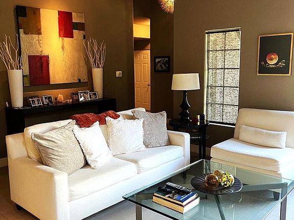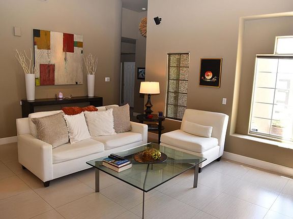 A pristine home, move in ready! 24' porcelain tile flooring, neutral tones, large kitchen with extensive cabinets (knotty pine) and large central kitchen island. Beautifully landscaped front yard with private entry gate to a welcoming front patio and covered entry. The rear yard has a well-maintained pool and spa. Tall green hedge surrounds the back yard providing complete Privacy! Bar B Q and patio furniture makes for a fun and inviting 'get together' with friends. Home is furnished with surround sound and TV -recessed into stone facing on the fireplace. Come take a look, you will be impressed!