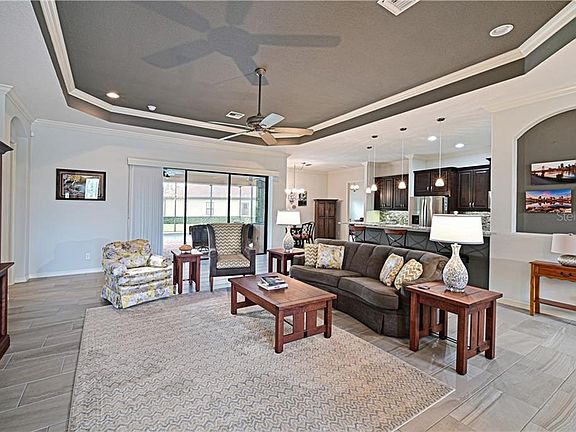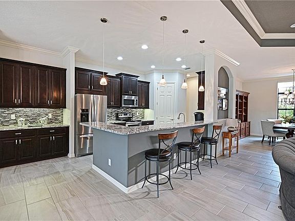- Interior Features: Ceiling Fans(s), Eating Space In Kitchen, High Ceiling(s), Master Bedroom Downstairs, Open Floorplan, Split Bedroom, Stone Counters, Walk-In Closet(s), Crown Molding, Solid Wood Cabinets, Kitchen/Family Room Combo, Living Room/Dining Room Combo, Solid Surface Counters, Window Treatments, Dry Bar, Tray Ceiling(s)