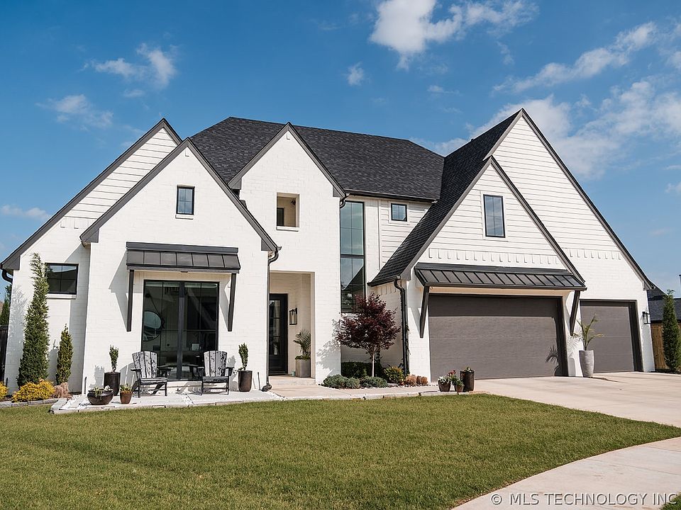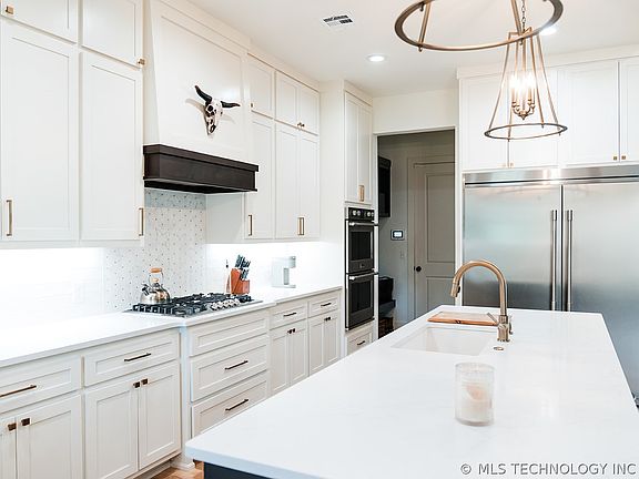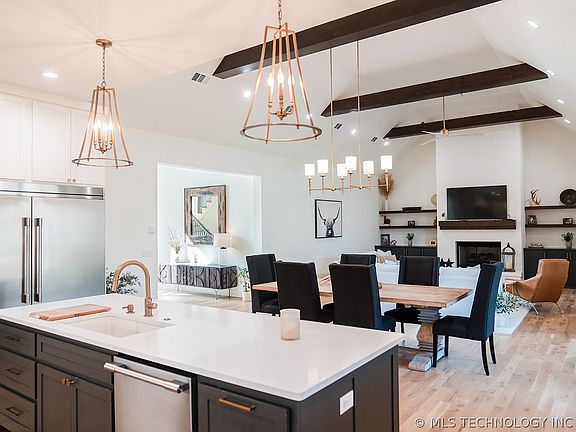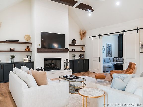 This custom-built home is located on a spacious cul-de-sac lot in a gated community in Southeast Jenks. It offers 4 bedrooms (2 bedrooms down), 4 bathrooms, 1 half bath, a 3-car garage, a media room downstairs, and a game room upstairs. The open-concept living space features soaring vaulted and beamed ceilings. The custom kitchen is equipped with dual sinks, double ovens, professional-grade appliances, and custom cabinetry throughout. The home boasts extensive hardwood floors, a beautiful master suite with a spa-like bath and a large walk-in closet, an outdoor fireplace, and ample room for a pool.
