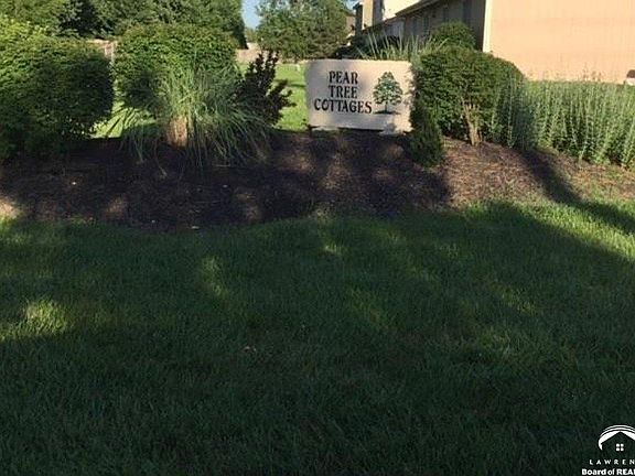 WOW! Pear Tree Cottages rare opportunity, 2 bed 1 bath corner townhome w wonderful sunshine all year long. Fabulous location that feels like country living yet close to shopping/freeways & on KU bus line. Easy front door shaded parking, nature/bike trails across the street, lots of yard area right off the patio that the HOA takes care of for $84mo. (HOA includes structural insurance, roof and exterior siding/replacement, trash, lawn & snow and private street maintenance.). No sign.