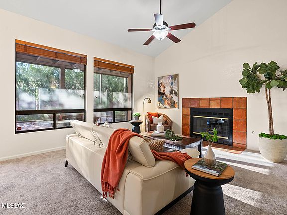 Welcome to Hill Farm living, where mature trees and darling homes surround a small lake. This charming 2 bedroom 2 bath home with a large den/office offers perfect functionality and elegance with it's soaring ceilings! Featuring a gated courtyard entry, and a two car garage, this home is situated on a corner lot next to open common area. Across the street, explore the famous San Pedro Chapel with roots dating back to the early 20th century. The light-filled kitchen w/ all-white appliances boasts a sliding door to enjoy outdoor gardening. A cozy fireplace with a tile surround warms the living area and the enclosed Arizona room provides a perfect retreat. The backyard has peek-a-boo view of the Catalinas. The den's mirrored wall offers versatility-it can serve as a home gym, office, or creative space. The primary suite boasts a sitting area, a garden tub, and dual vanities. The secondary bathroom has a shower/tub combination and is easily accessible to guests. Come make your own individual touches to this rare find.