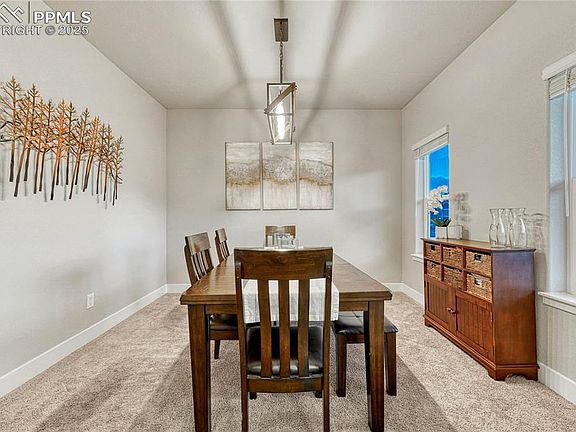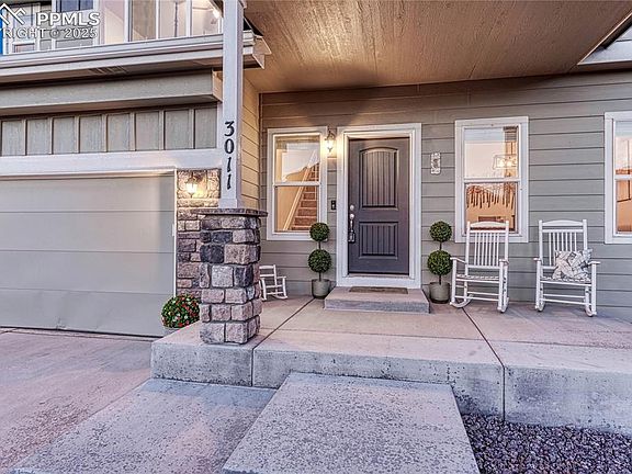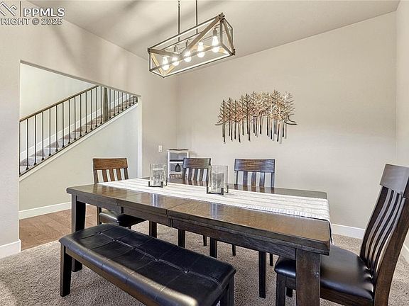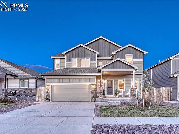 *5 Bed *4 Bath *3 Car tandem garage *Finished Basement *AC *Pikes Peak view from Primary *Extended patio This beautiful home in The Sands, zoned for D49 schools, offers modern elegance, comfort, and tranquility. Prepare to be captivated by gorgeous Pikes Peak mountain views and beautiful curb appeal. Step inside and be greeted by a grand two-story entrance that flows into a bright and airy open floor plan with soaring ceilings and beautiful engineered wood floors. Oversized windows throughout the home flood the space with abundant natural light, complemented by stylish cordless blinds. Immediately to the right is a spacious formal dining room. The upgraded kitchen offers custom upgraded charcoal cabinetry, granite countertops, a spacious island with a breakfast bar, all stainless steel appliances, a stainless steel sink, and a large pantry. The eat in kitchen easily accommodates a large table and opens seamlessly to the inviting living room, perfect for cozy evenings. Extend your living space outdoors through the main level walk-out to an extended concrete patio and a backyard that backs to a walking trail with privacy fencing – an ideal setting for entertaining guests. Retreat to the luxurious primary suite on the second story, complete with two closets (including an oversized walk-in) and a spa-like 5-piece master bath featuring quartz countertops, a deep soaking tub, a separate walk-in shower, and double vanity. A convenient upper-level laundry room with ceramic tile flooring is located near a small loft area. Three additional large bedrooms, each with oversized closets, and another full bath with ceramic tile and quartz countertops provide ample space for family or guests. The finished basement offers an additional bedroom, full bath, bar area with refrigerator and a large living space. The neighborhood provides quick access to the Powers Corridor, and is conveniently located near Peterson SFB, and Schriever SFB.