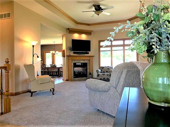 Absolutely gorgeous 4 bedroom ranch on a finished walk out basement! Outstanding quality and pride of ownership throughout! This home is beautifully designed with a split bedroom floor plan, open stairway to the lower level, lovely 2 way fireplace between the kitchen and the great room, pretty maple cabinets and quartz counter tops in the kitchen and a master bath with double sink vanity jetted garden tub and walk in shower. The walkout lower level is exceptionally nice! It features 1568 sq ft with a wet bar, a huge recreation room, fireplace, bedroom, full bath and tons of storage! Outside, the landscaping is just lovely. From the covered porch in the back, a set of beautiful curved stone steps lead down to the 32 x 18 patio for outdoor entertaining with family or friends and quiet conversation around the built in fire pit in the evening. Other amenities include new stainless LG appliances in the kitchen, 3 car garage and a neighborhood pool and tennis club. You must see this home!