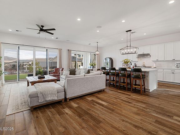 Set within the highly regarded gated enclave of Copper View at Carmella Ranch, this beautifully designed single-level residence offers an elegant balance of refined entertaining spaces and serene everyday living. Featuring 3 bedrooms, 2.5 bathrooms and a 3-car garage, this home is further distinguished by one of the larger lot sizes within the community, providing a rare sense of openness. The open-concept layout is thoughtfully curated with high ceilings and multiple oversized glass slider doors that frame tranquil backyard views while inviting abundant natural light throughout the home. At the heart of the residence, the kitchen pairs crisp white cabinetry with stainless steel appliances, seamlessly anchoring the living and dining spaces for effortless gathering and connection. The primary suite is positioned to capture open and mountain views and the spa-inspired primary bath features a generous walk-in shower with a rain shower head, while a custom built-in closet system completes that suite with both style and function. Wood-look tile flooring and Craftsman style doors add warmth and continuity, complemented by a soft, neutral palette that enhances the homes timeless and inviting aesthetic. Both the front and backyard are tastefully xeriscaped, offering appeal with minimal upkeep. Ideally located within walking distance to the community pool and clubhouse and surrounded by mountain scenery, this residence captures the essence of relaxed luxury living in one of South Reno's most sought-after gated communities.
