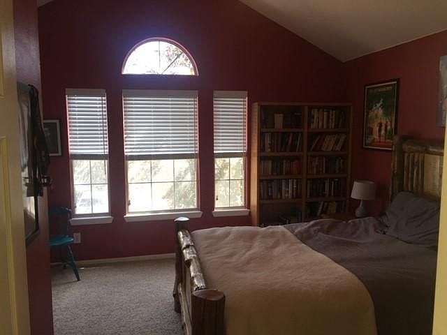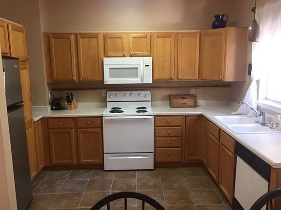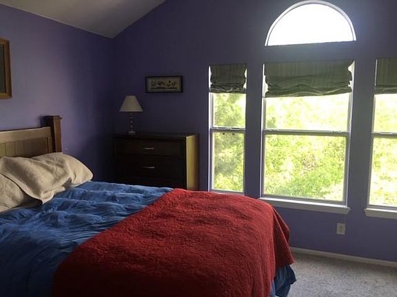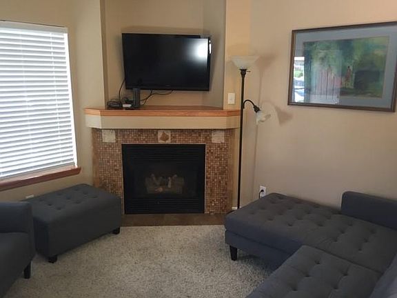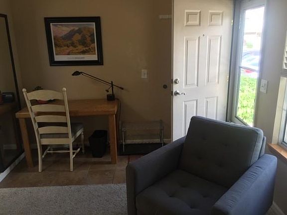 Two bedroom townhouse with vaulted ceilings in upstairs bedrooms. End unit with large windows. Each bedroom has a private bathroom. Fenced in patio with open space behind the unit. Owner pays for water, trash, and sewer through HOA.