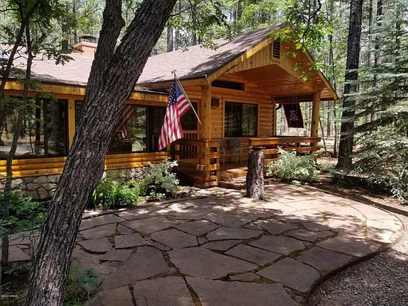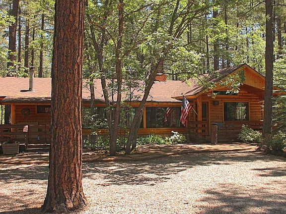 Absolutely charming cabin sitting on large lot backing Tract C. Beautiful knotty pine interior, vaulted ceiling, sky lights, open & bright. 2 bed + 2 bath. 2 car garage with built in work area. Hardwood oak floors, carpet & tile. 5 ETS heaters. All electric. Remodeled over past 20 years, ceiling fans, Arizona room with large windows opening to super deck covered & uncovered. Heavily treed lot/ Big Oak trees and circle drive.