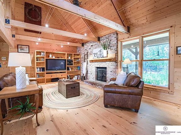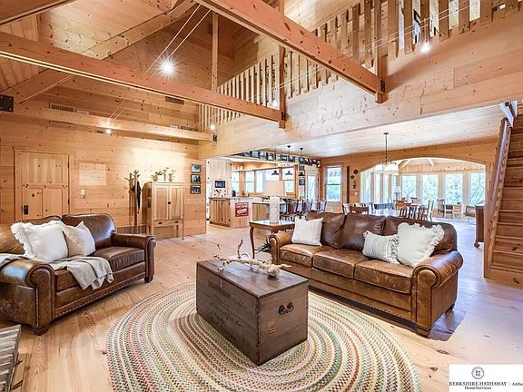 Contract Pending . On market for backup offers only. RARE - 2.87 ACRE PRIVATE LAKE RETREAT ON 90 ACRE SPRING FED WOLF LAKE (NOT IN A FLOODPLAIN) & short beautiful drive to Omaha & Lincoln metro areas! Perfect for a get-away or to live there year-round! Owner is a builder & property has character & quality craftsmanship throughout. Open flexible floor plan. 1.5 story, 6 bed, 3 bath, 4 car (with Lake Storage). Real wood walls, ceiling & floors throughout (no carpet), vaulted great room with wood cross beams looking to upper balcony & real stone fireplace. Master Suite with vaulted ceiling & spacious full bath. Sunroom, pocket office/pantry, 2nd kitchen walks to outside, 3nd main floor beds, 3 upper beds with 3/4/ bath. Maintenance free exterior & full sand lot with wildflowers & surrounded by gorgeous trees. Enjoy quite evenings under the stars, ride bikes & ATV's, motorized boats allowed to 25mph, kayak & paddleboard peacefully, fishing is amazing! Dock included. A slice of heaven by th