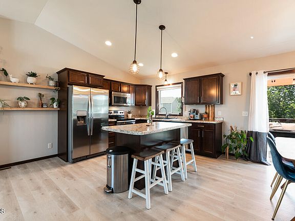 Imagine coming home to this picture-perfect home—a 4-bedroom, 3-bathroom haven that will captivate you from the moment you arrive. As you enter the large foyer, you'll be greeted by the convenience of garage access and a spacious closet, setting the tone for the exceptional features that await. Ascend the stairs to the bright and open-concept living, kitchen, and dining area, where updated laminate floors, a classy fireplace, custom shelving, and beautiful cabinetry seamlessly come together. Through the sliding glass door you'll find yourself on a great deck, overlooking a spacious and private outdoor haven. Relax under the canopy, enjoy the ambient lighting, and take in the ideal setting for entertainment and relaxation. Just down the hall is the first full bathroom and bedroom. Also on this level, the primary suite easily accommodates a king-sized bed and much more, and includes a walk-in closet and ¾ bathroom. Downstairs you'll find a huge family room/theater room that includes theater equipment and a wet bar! There is a ton of under-stair storage, and across from that is the utilities and laundry room—you'll love the convenient soaking sink, folding space and shelving. The large 3rd bathroom is on this level, along with two more abundantly sized bedrooms. This home was built with 2x6 frame construction, comes with an active radon mitigation system, and has been meticulously cared for and loved. The 724sf triple garage is insulated, heated and includes a floor drain. Outside is just as great! There is a large parking pad that leads to a rocked patio area behind the garage, beautiful landscaping surrounds the home, and the fantastic backyard. Schedule your viewing today!